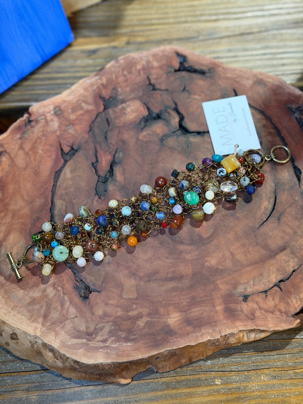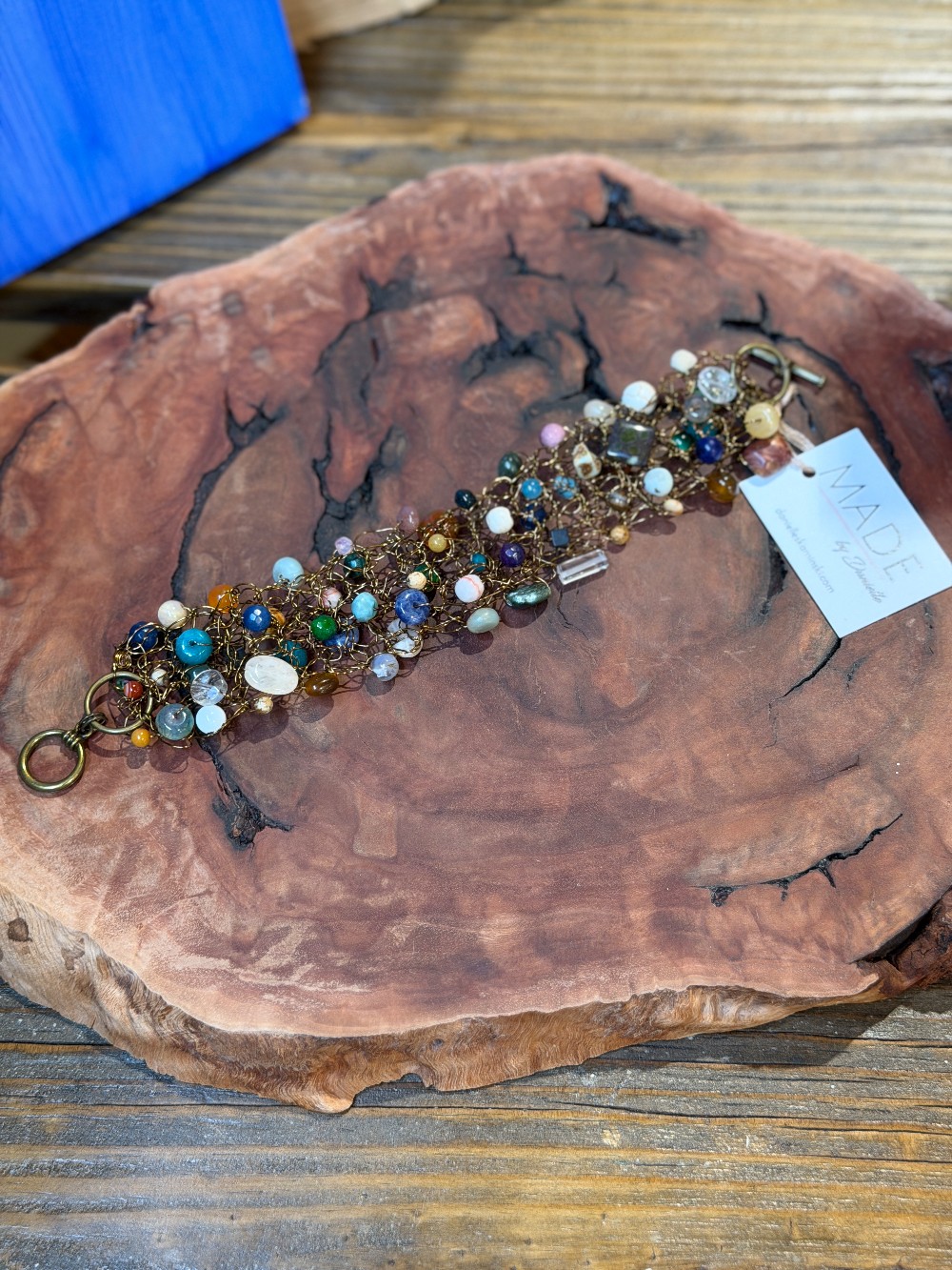 Created with a variety of natural gemstone beads, these bracelets are made using a combination of crochet and wire wrapping techniques. Each measures approximately 1.5" wide with a toggle clasp closure.