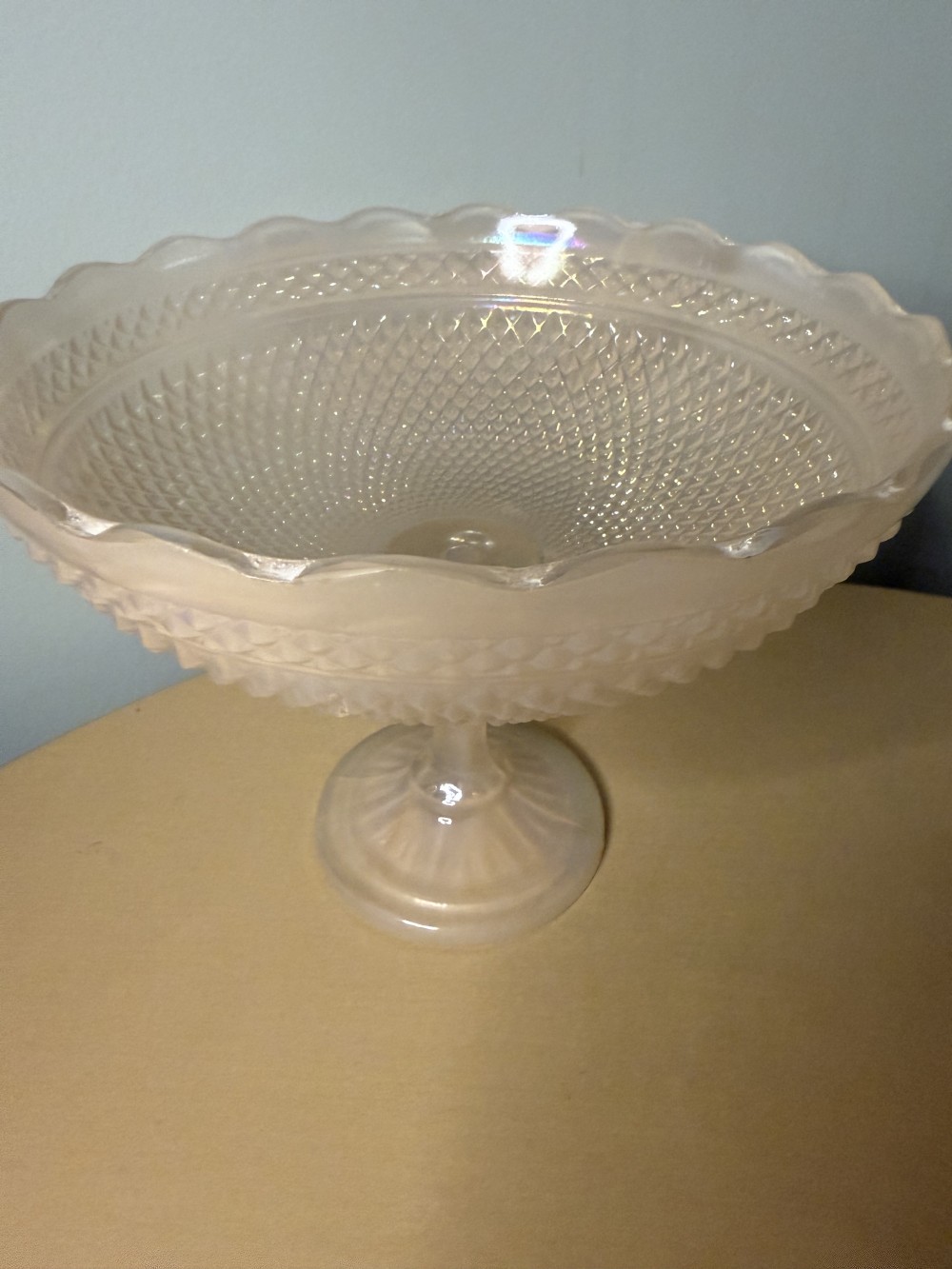 Soft pink iridescent footed bowl by Creative Co-op (not vintage) 7.25" tall