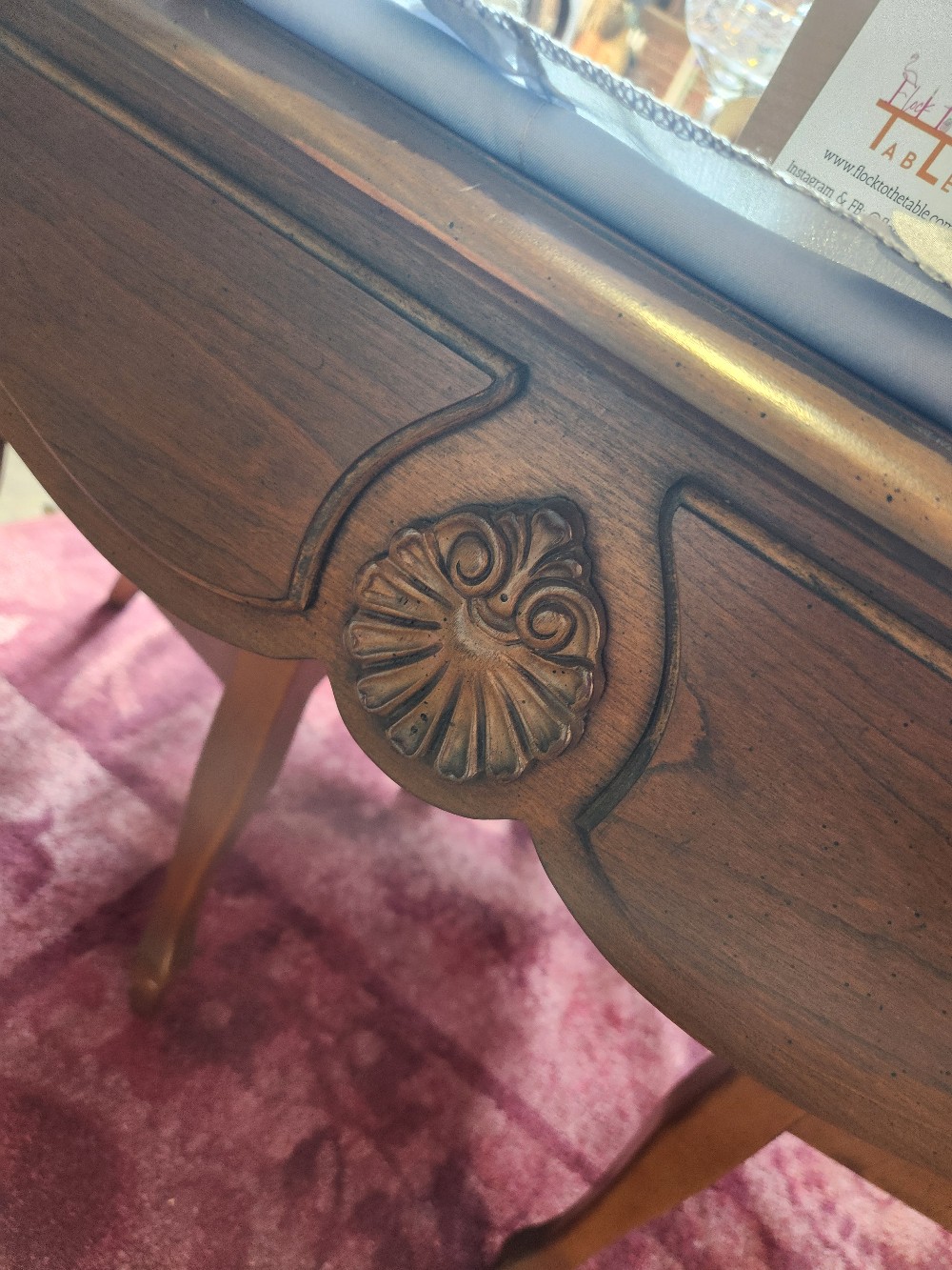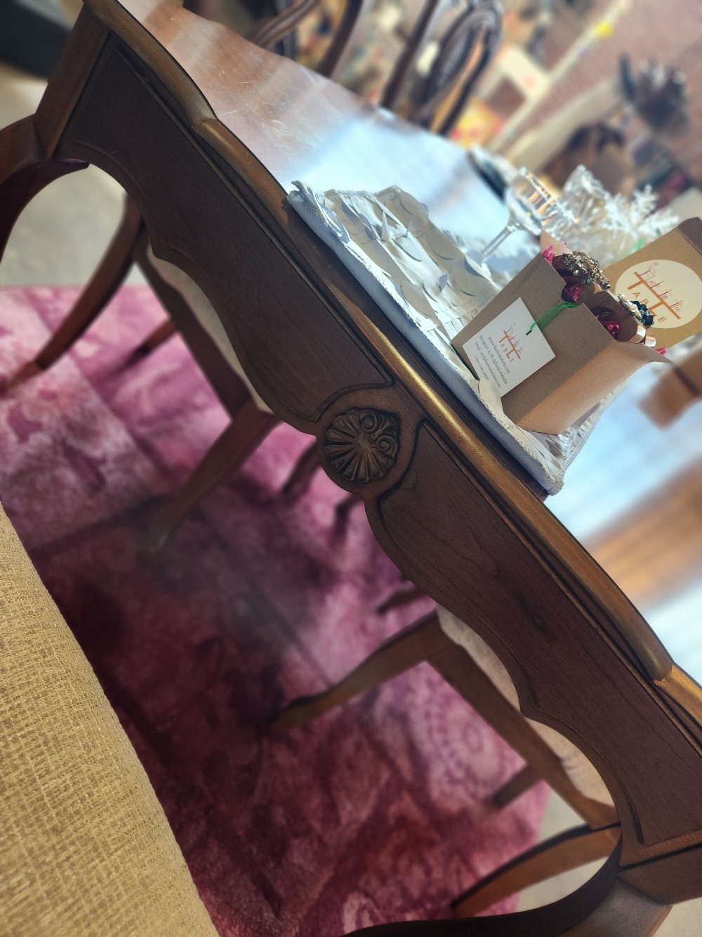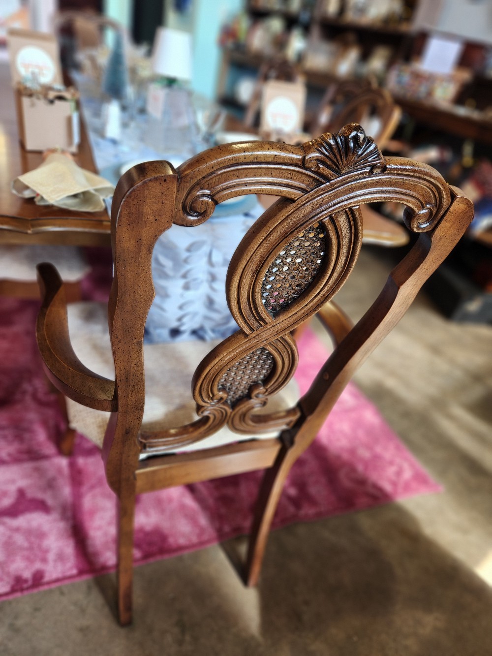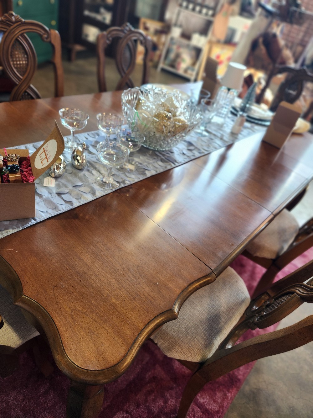 This gorgeous wooden dinette set is shown with two leaves inserted and can seat six comfortably.