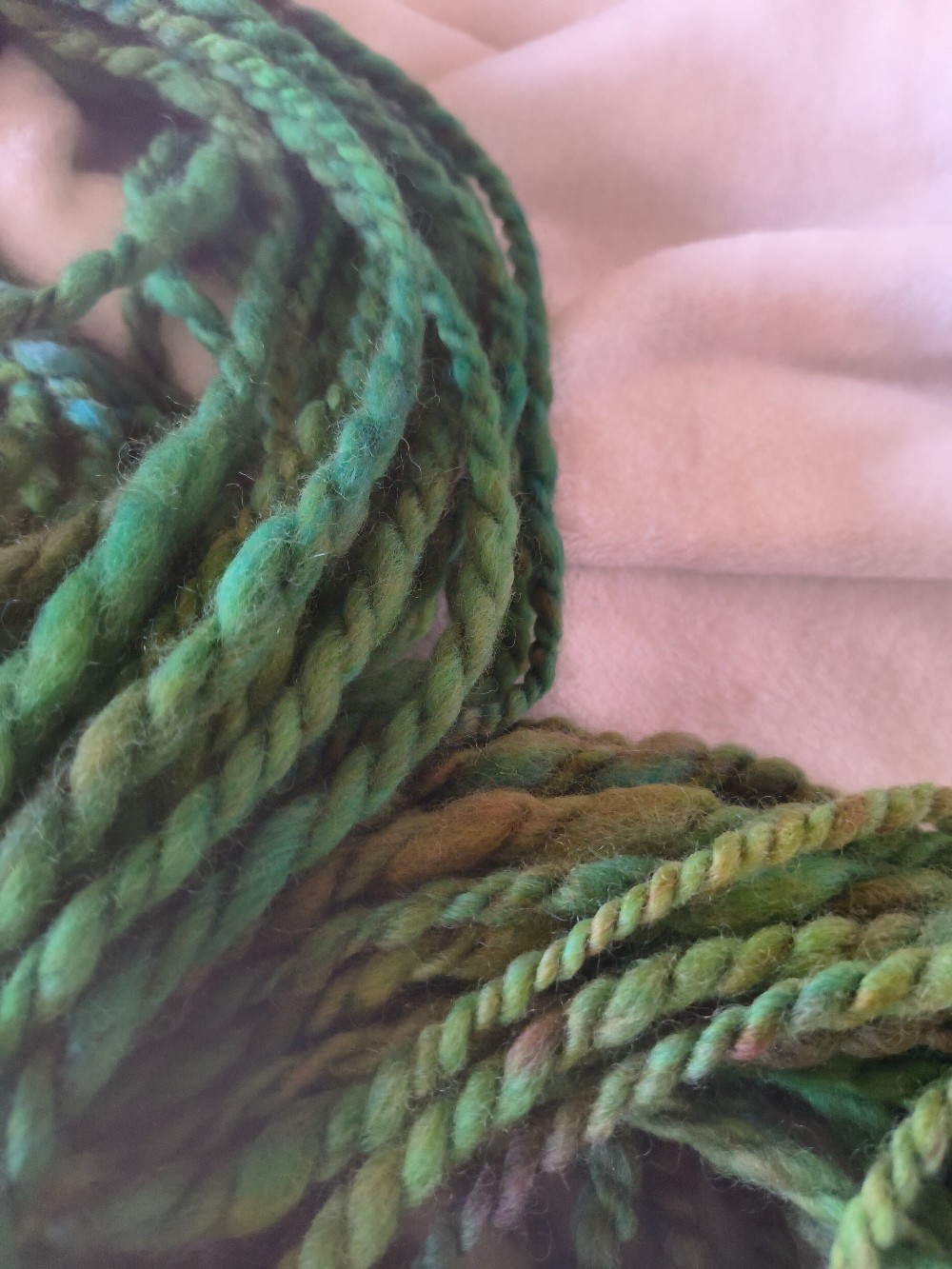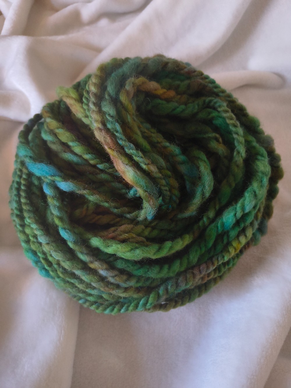 Green varigated two-ply hand dyed handspun art yarn. Approximately 52 yards . Two separate skeins (20 and 32 yards). New Zealand wool is not next to skin soft, but very durable and warm.