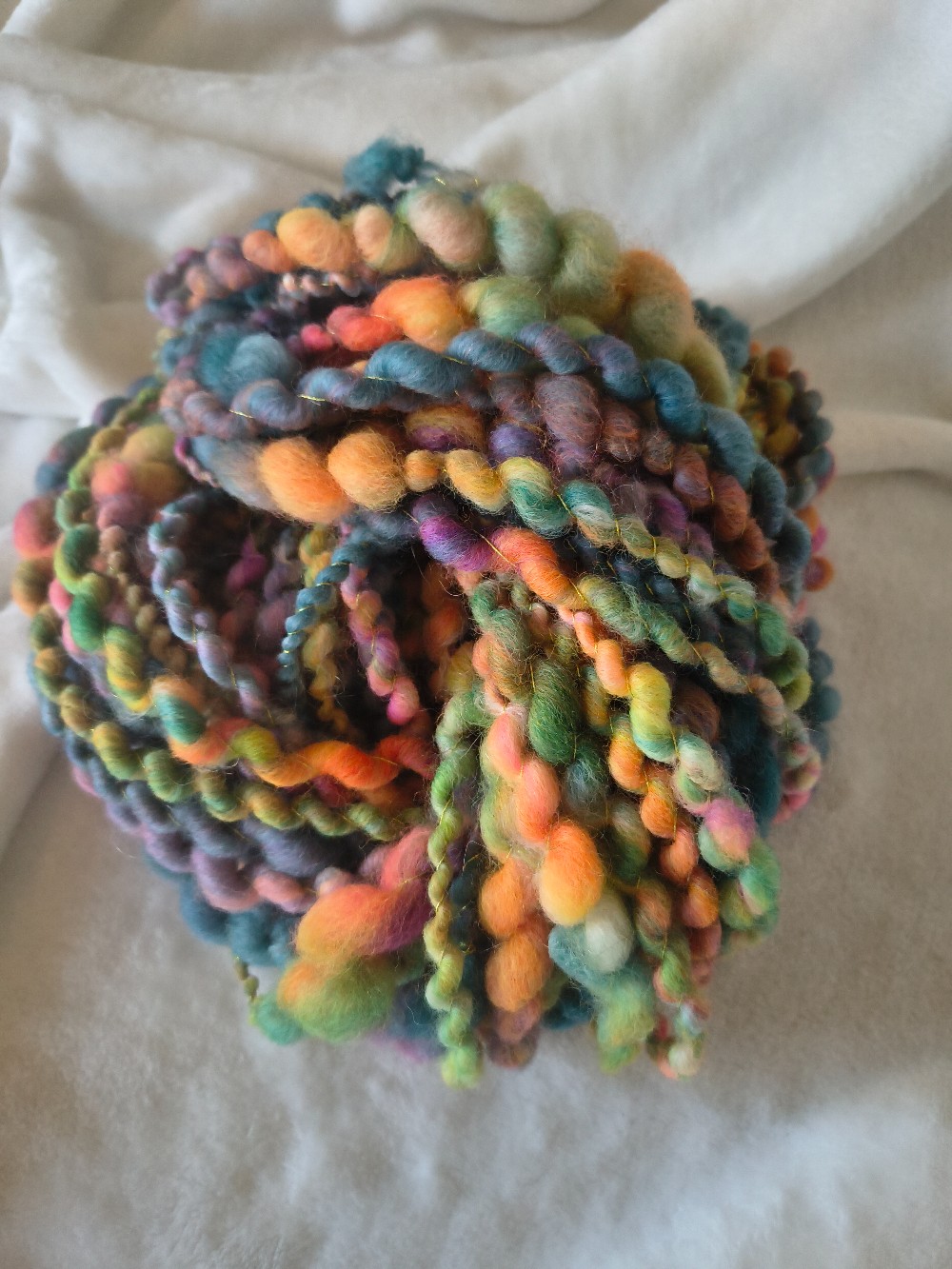 Just like the name inplies this yarn is loaded with lots and lots of color! Super bulky squiggle/beehive/bubble ply handspun yarn. SO squishy!! Aprox 28 yards.