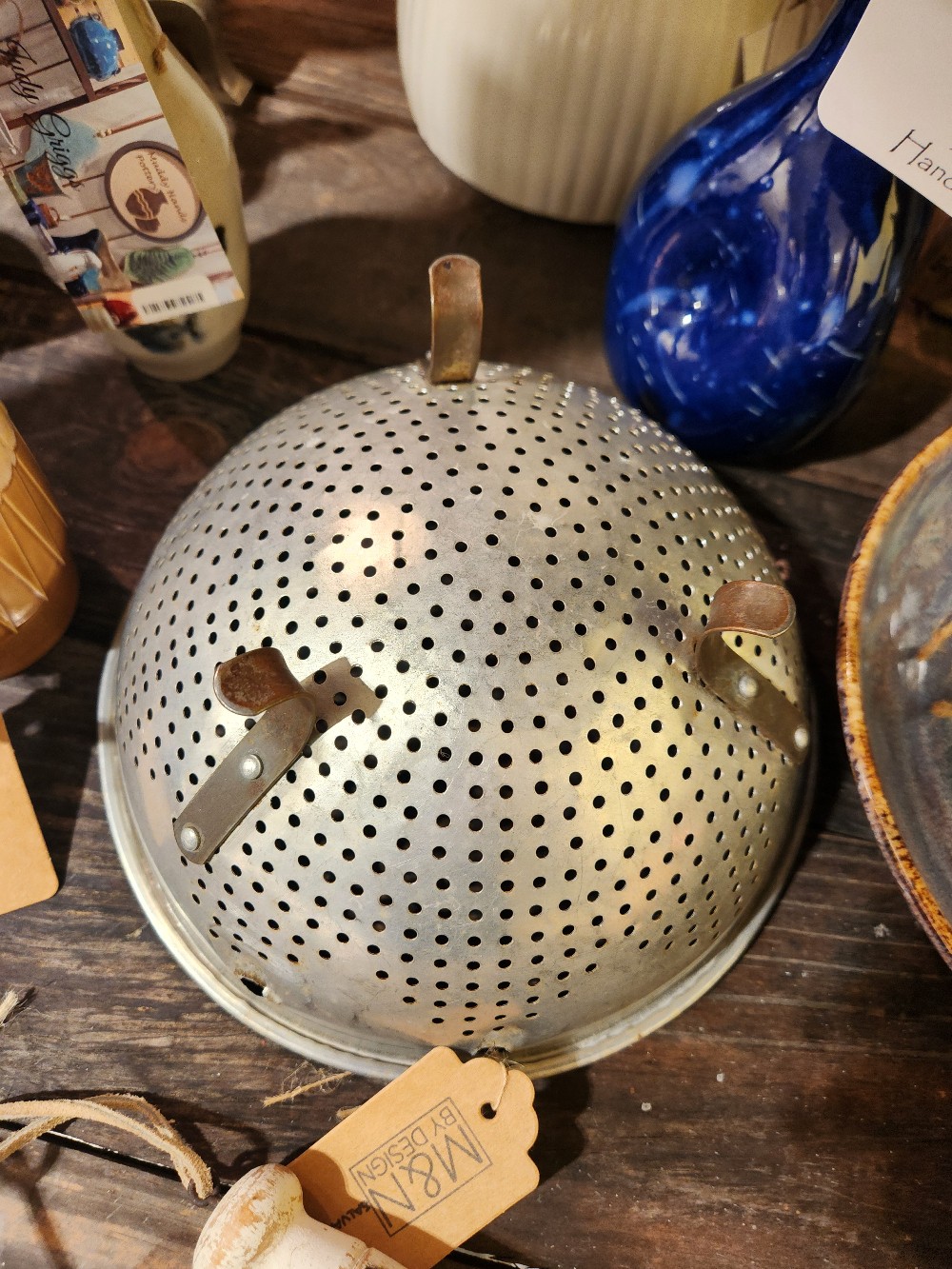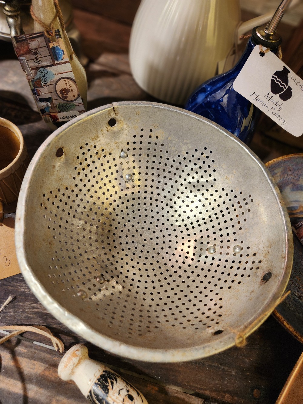 Aluminum colander. No handles, dented, as shown.