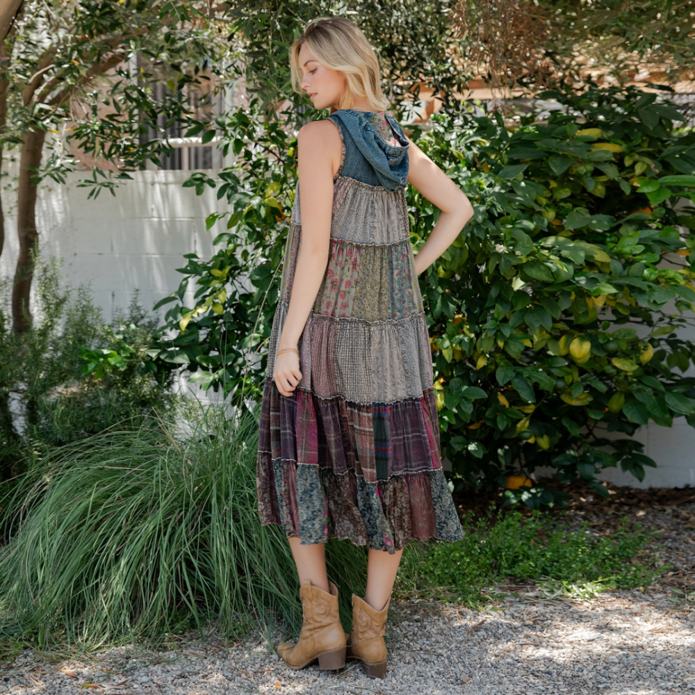 Boho sleeveless maxi duster featuring cotton check and rayon print patchwork, an attached hood, and an open-front silhouette—perfect for layering, travel, and festival-ready bohemian styling.