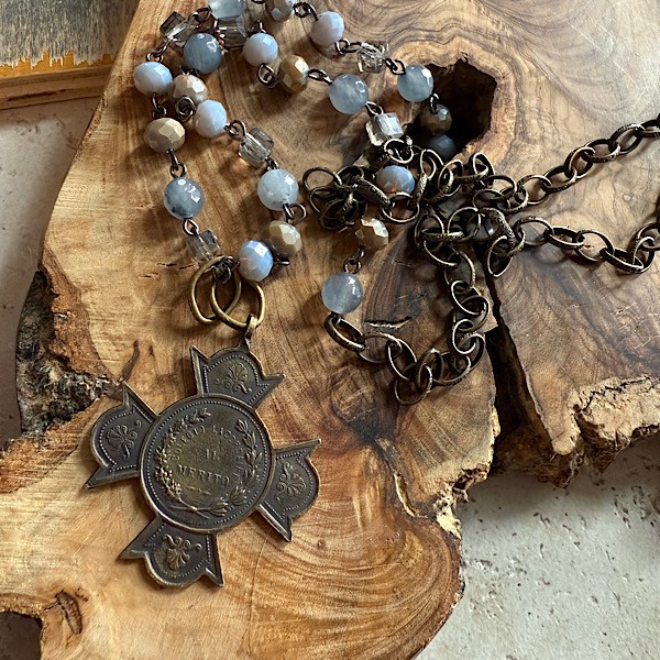Medallion in bronze on long mixed chain of stone/crystal beads and bronze chain