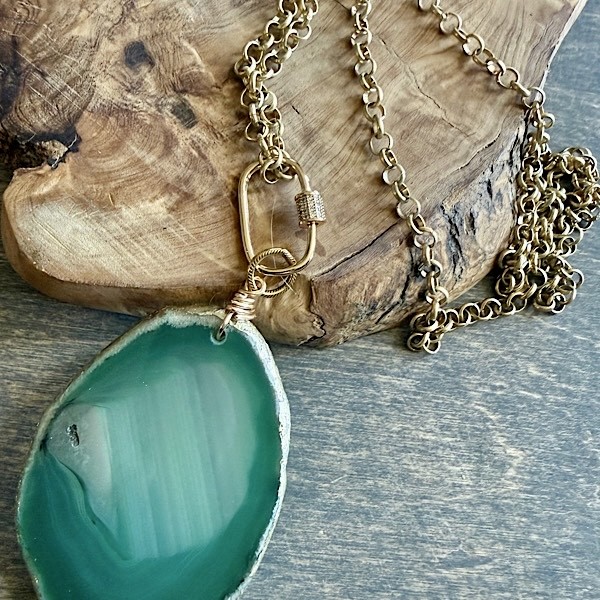 XL Green agate pendant with gold leaf edging hangs from crystal embellished carabiner clasp on long matte gold plated chain