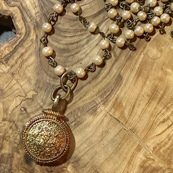 Vintage vibe locket w/copper toned patina on long chain of petite linked champagne glass pearls. Approx 30"