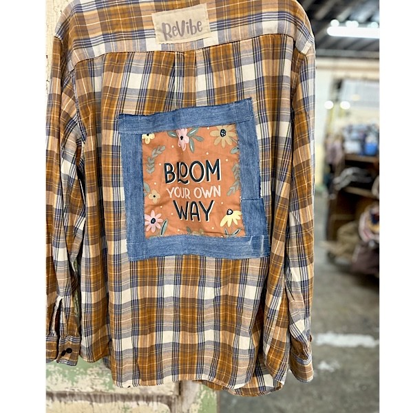 Flannel: Orange tones with blues , denim accents, granny square pockets and printed saying on back