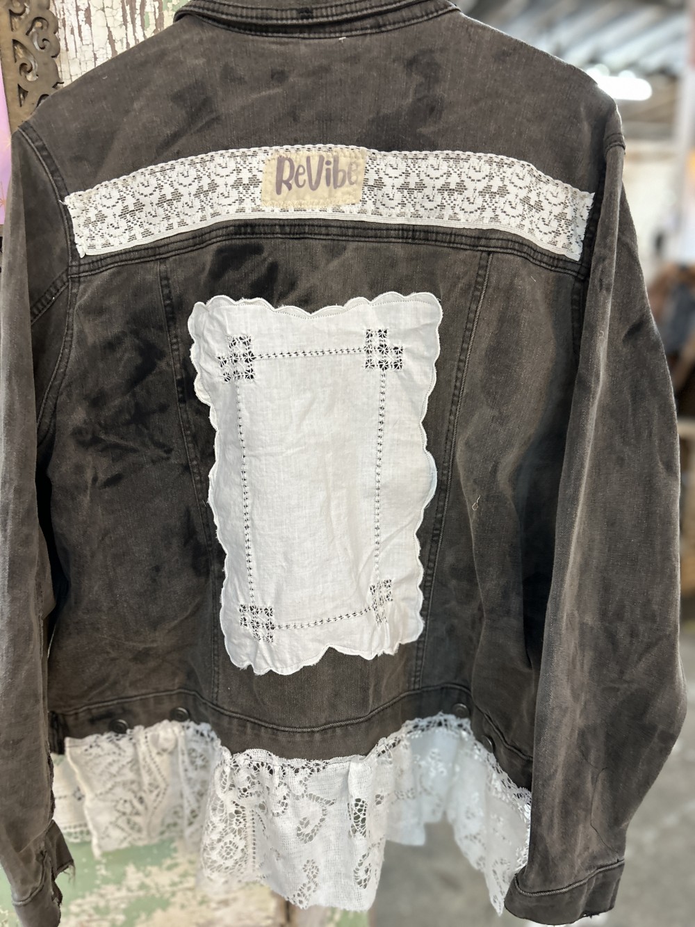 US Distressed Demin Jacket with lace ruffle and vintage doily on back