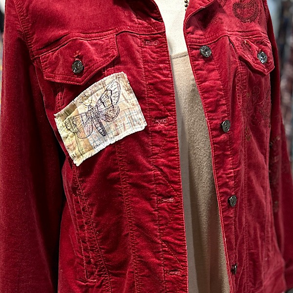 DDuster: Garnet velvet jacket top with printed skirt bottom and butterfly appliques