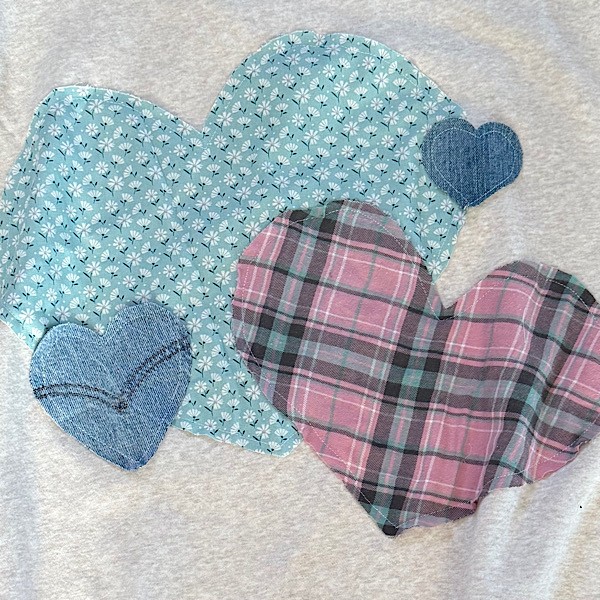 Sweatshirt: Heart appliques in aqua, pink and denim on oatmeal colored oversized sweatshirt. Size XL