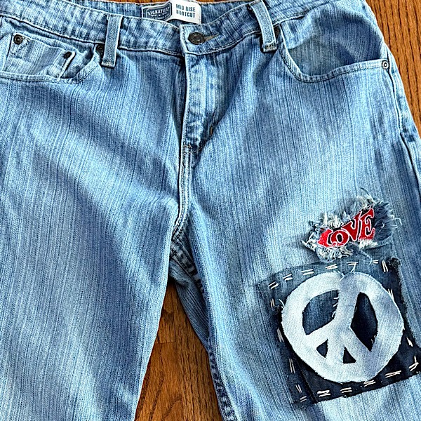 Jeans: Levi's Signature Midrise Bootcut patched jeans lighter mid wash with peace & love patches. Misses size 12 short