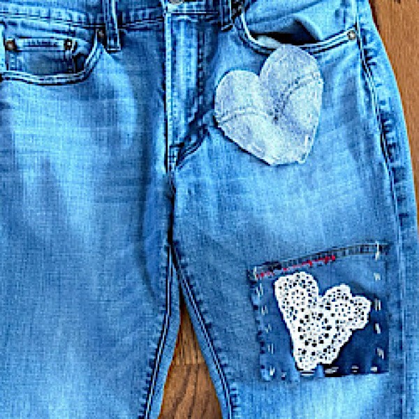 Jeans: Lucky Brand patched jeans mid wash with denim & doily heart patches. Size 12 slim