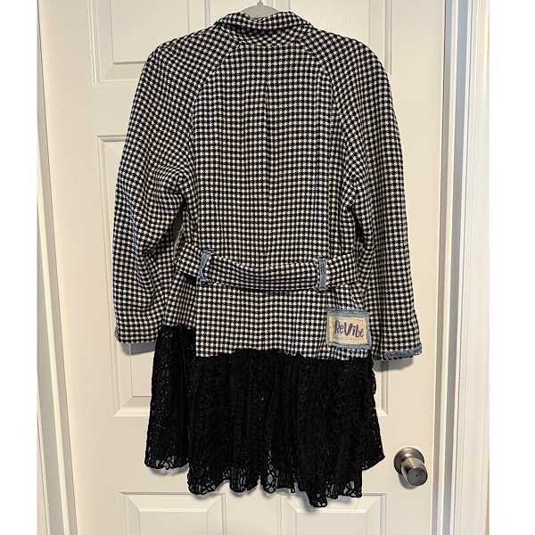 Jacket: Vintage black/white tweed belted blazer w/ black lace skirting and denim & button accents