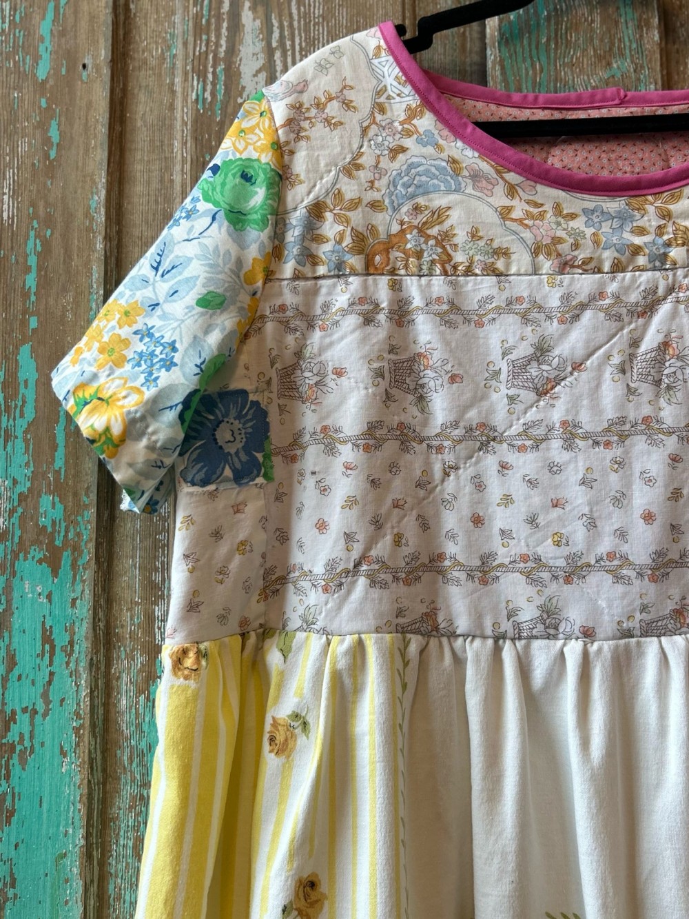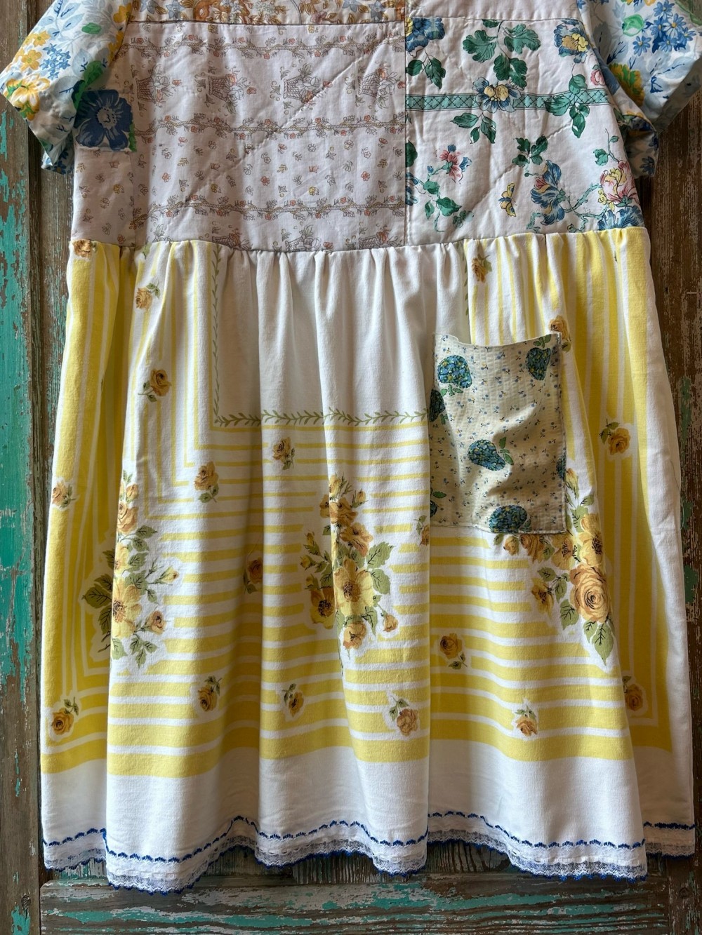 "Rosetta": She crafted using a vintage yellow floral tablecloth for the skirt, a vintage floral patchwork quilt for the bodice, and a vintage house apron for the sleeves and pocket.