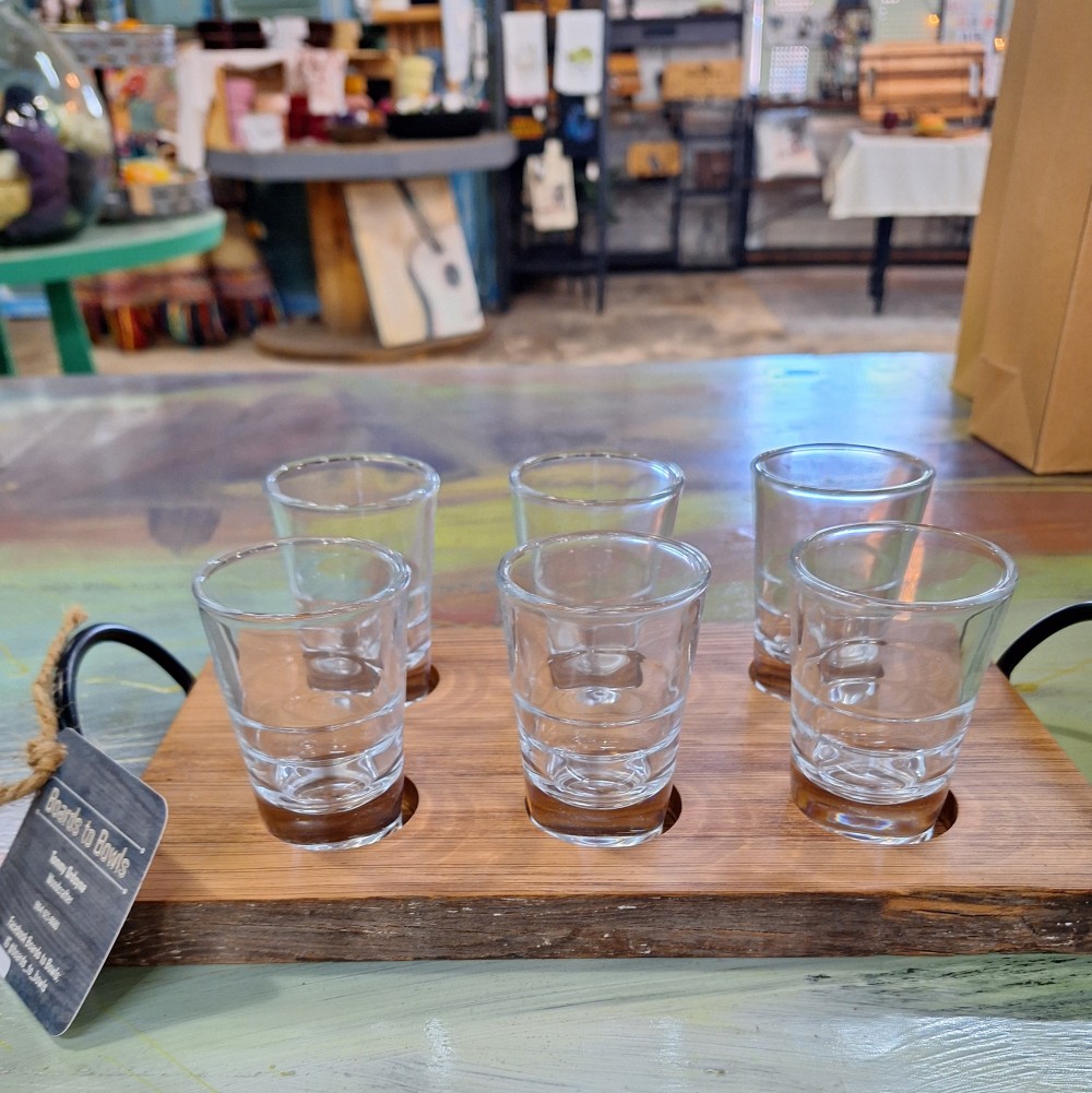 Wood recovered from old cotton mill in NC, black handles, price includes set of 6 shot glasses